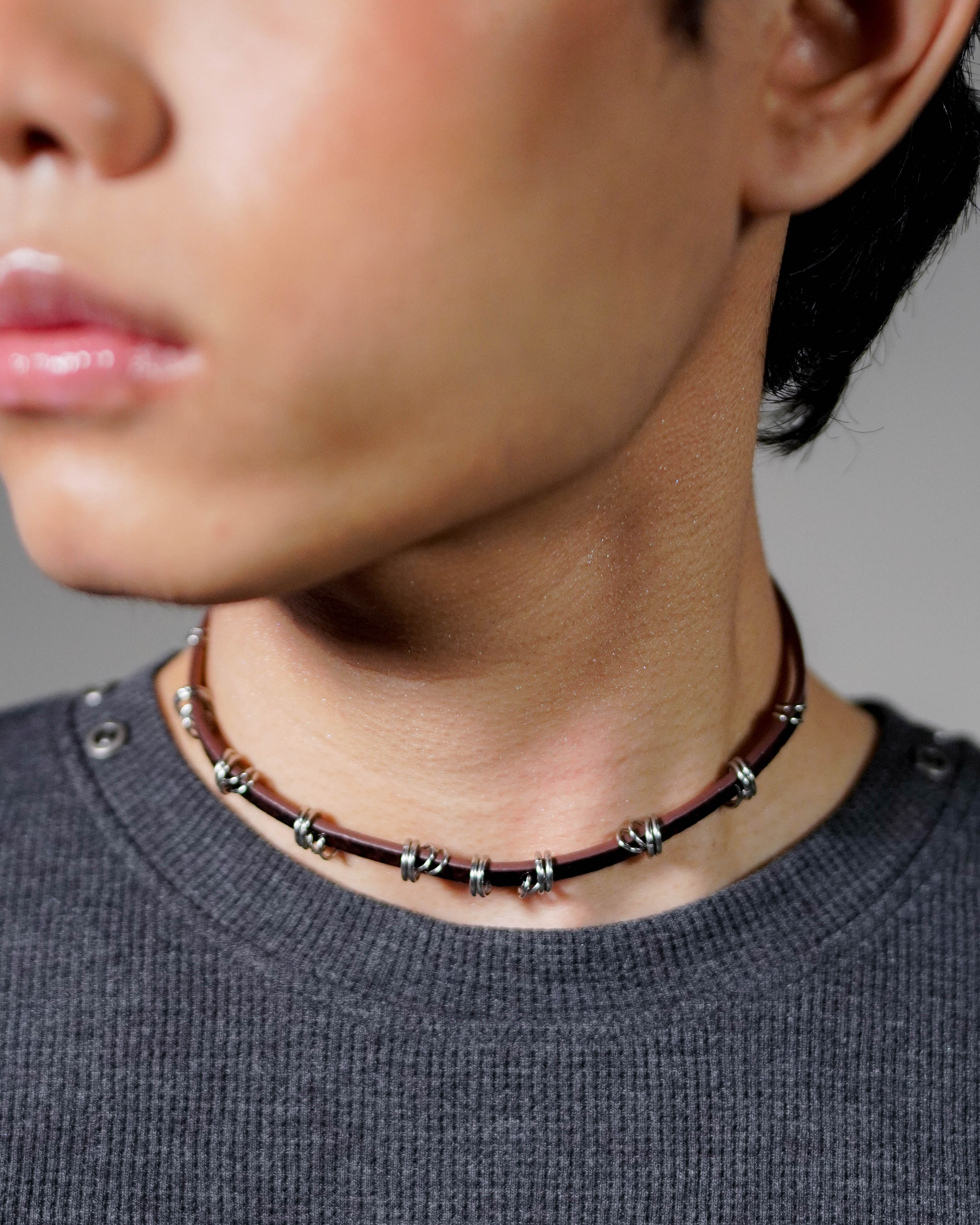 The Sling Choker wraps close around the neck with a smooth black band detailed with subtle metal wire loops. Minimal from afar, sharp up close.