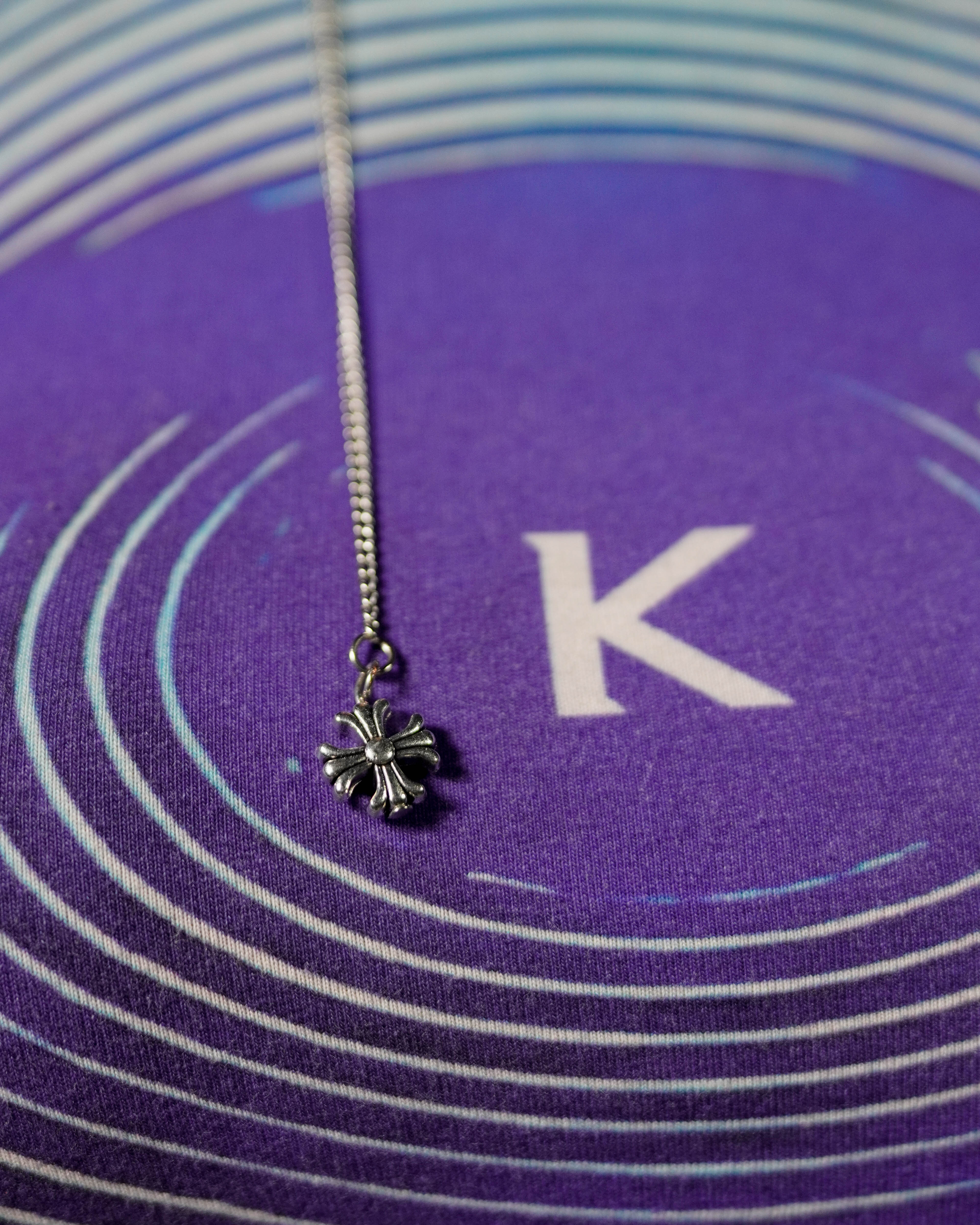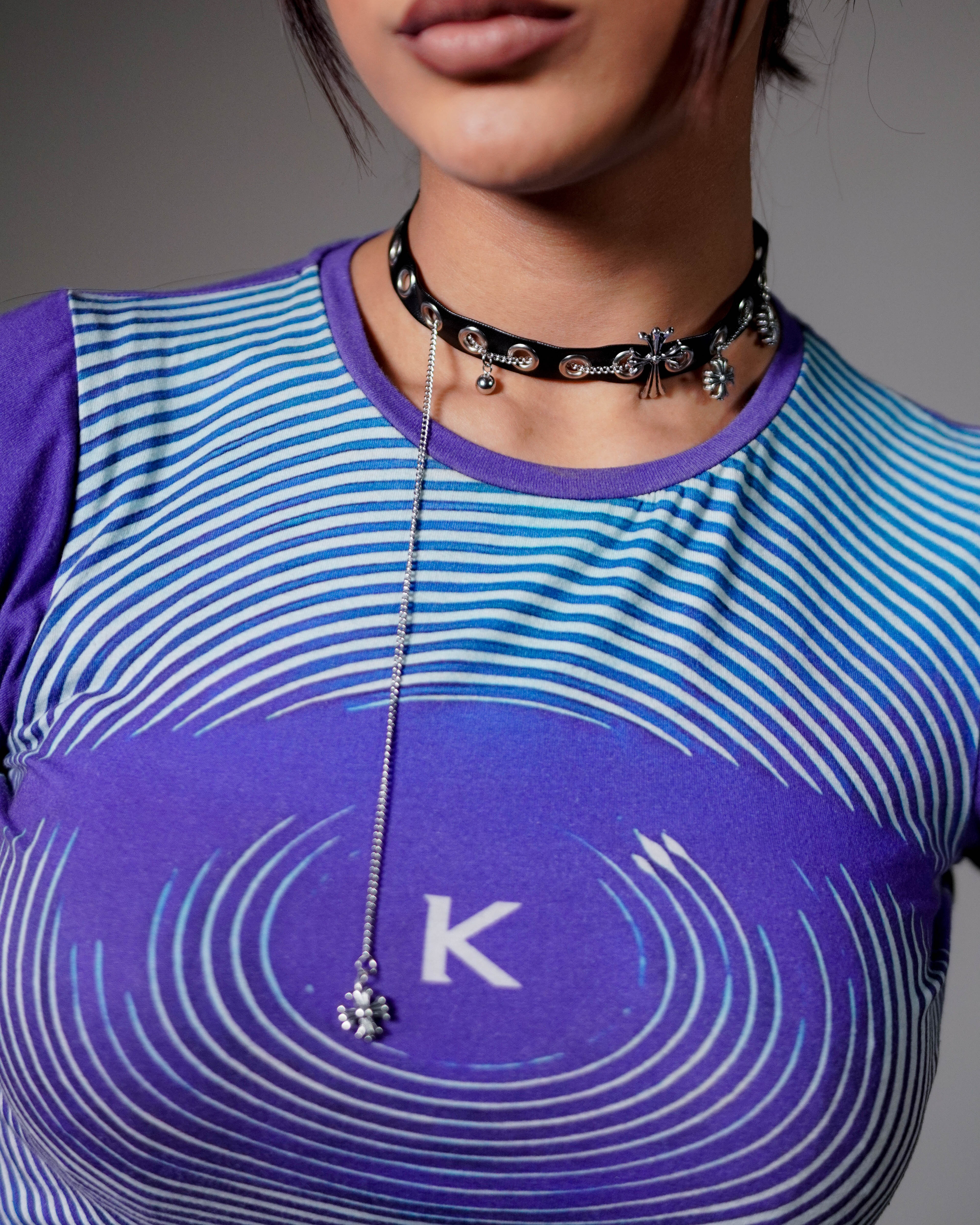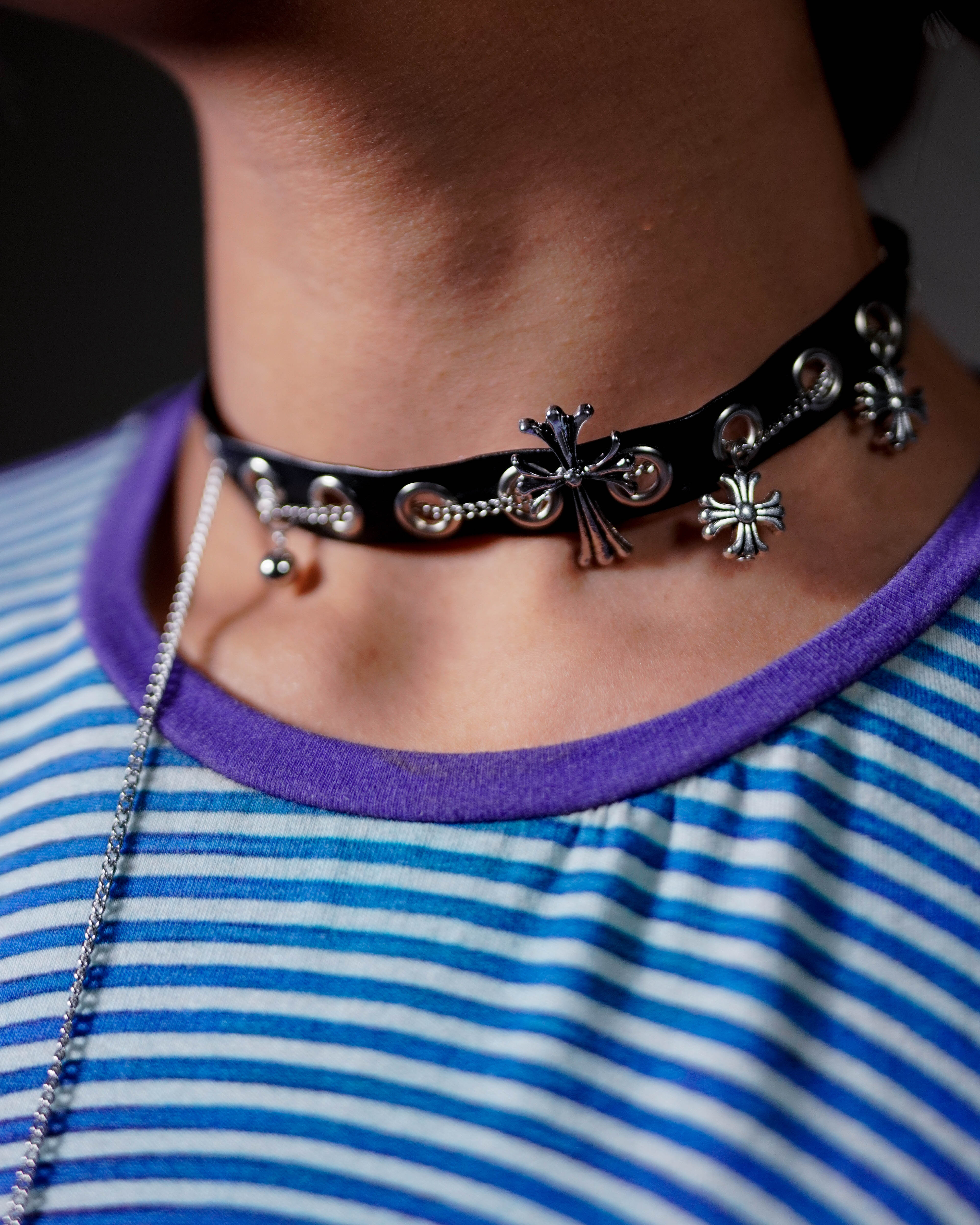 The Black Cross Choker sits firm at the neck with a glossy black band and silver eyelet detailing. Cross charms and fine chains wrap around the front, with a single drop chain that falls lower.