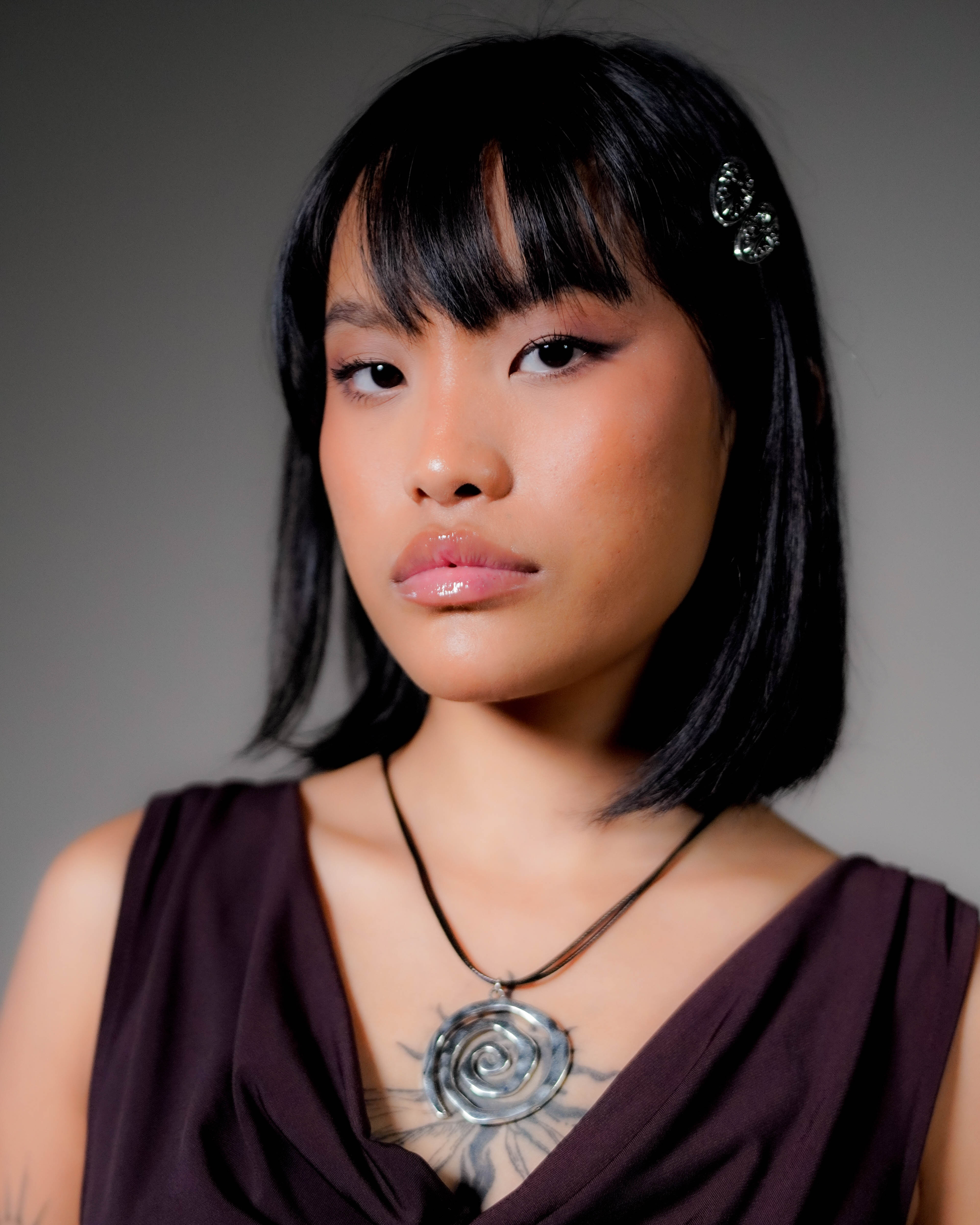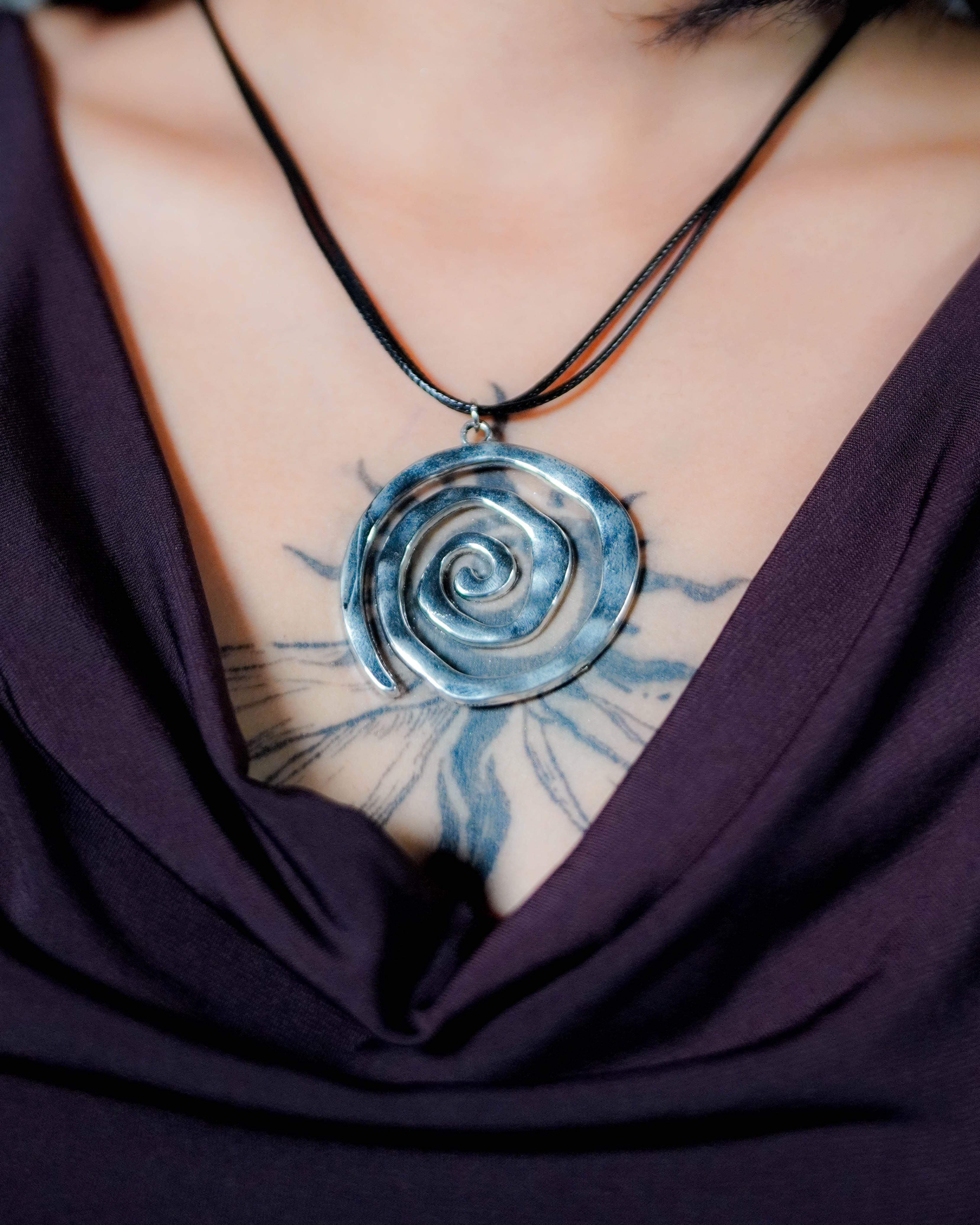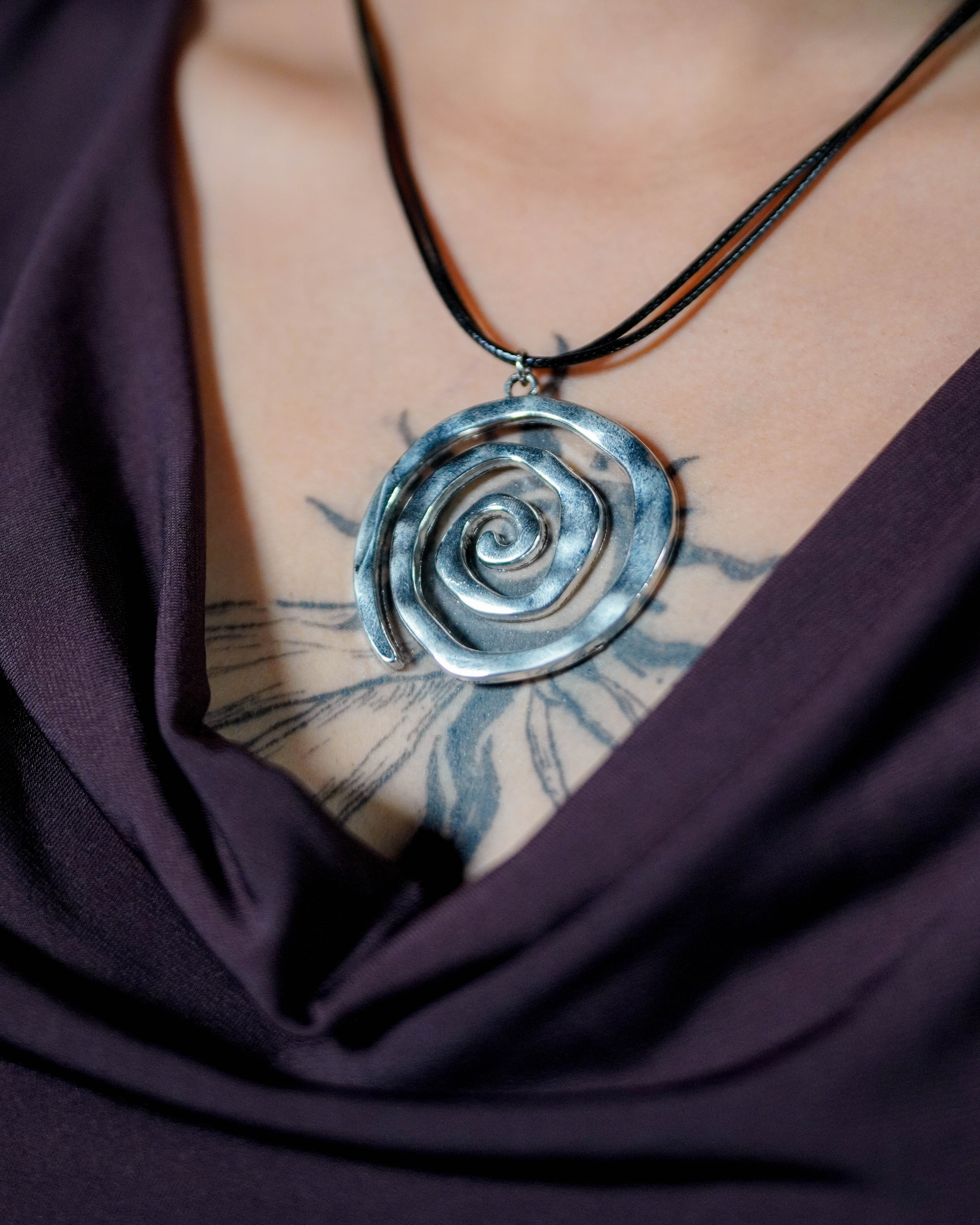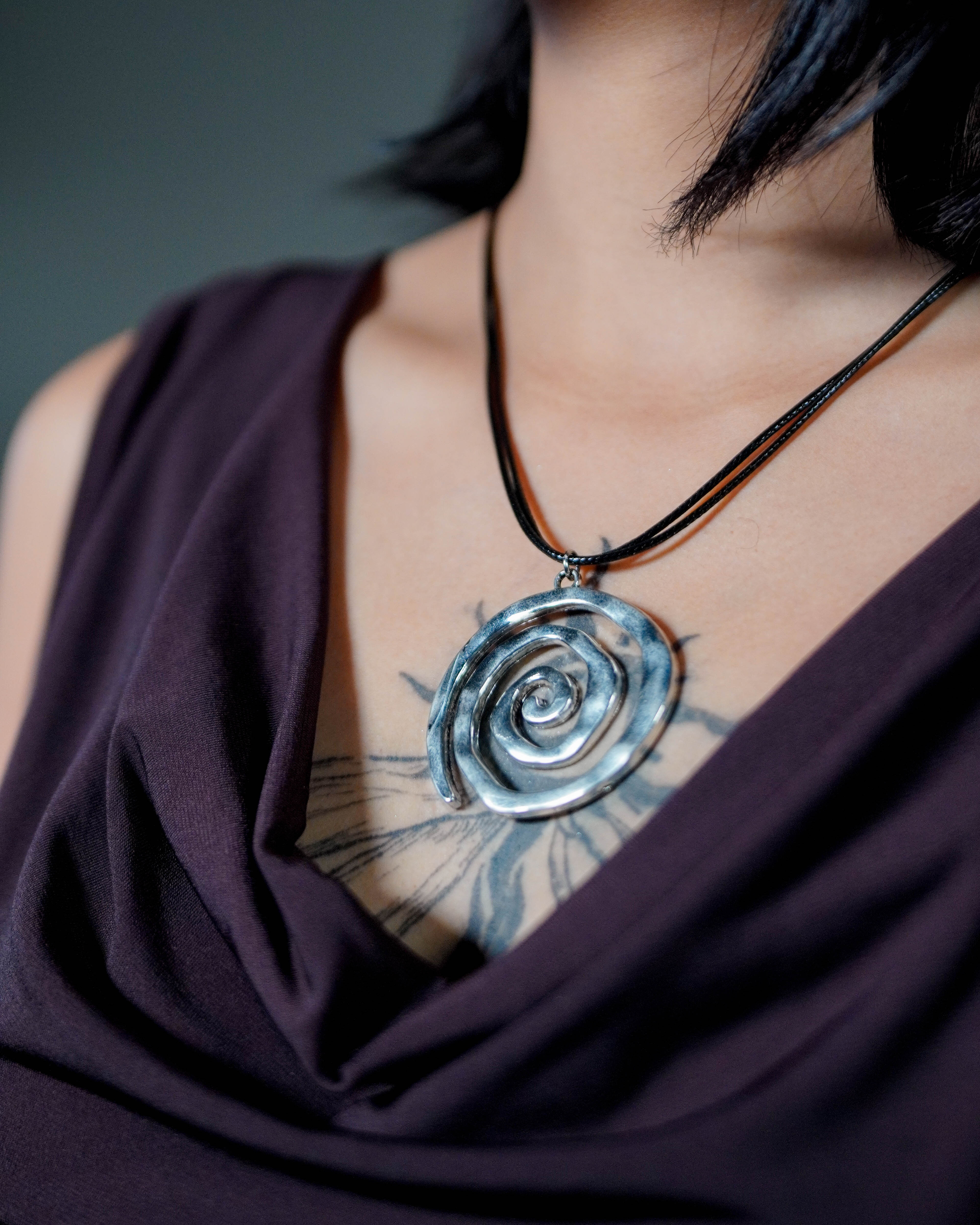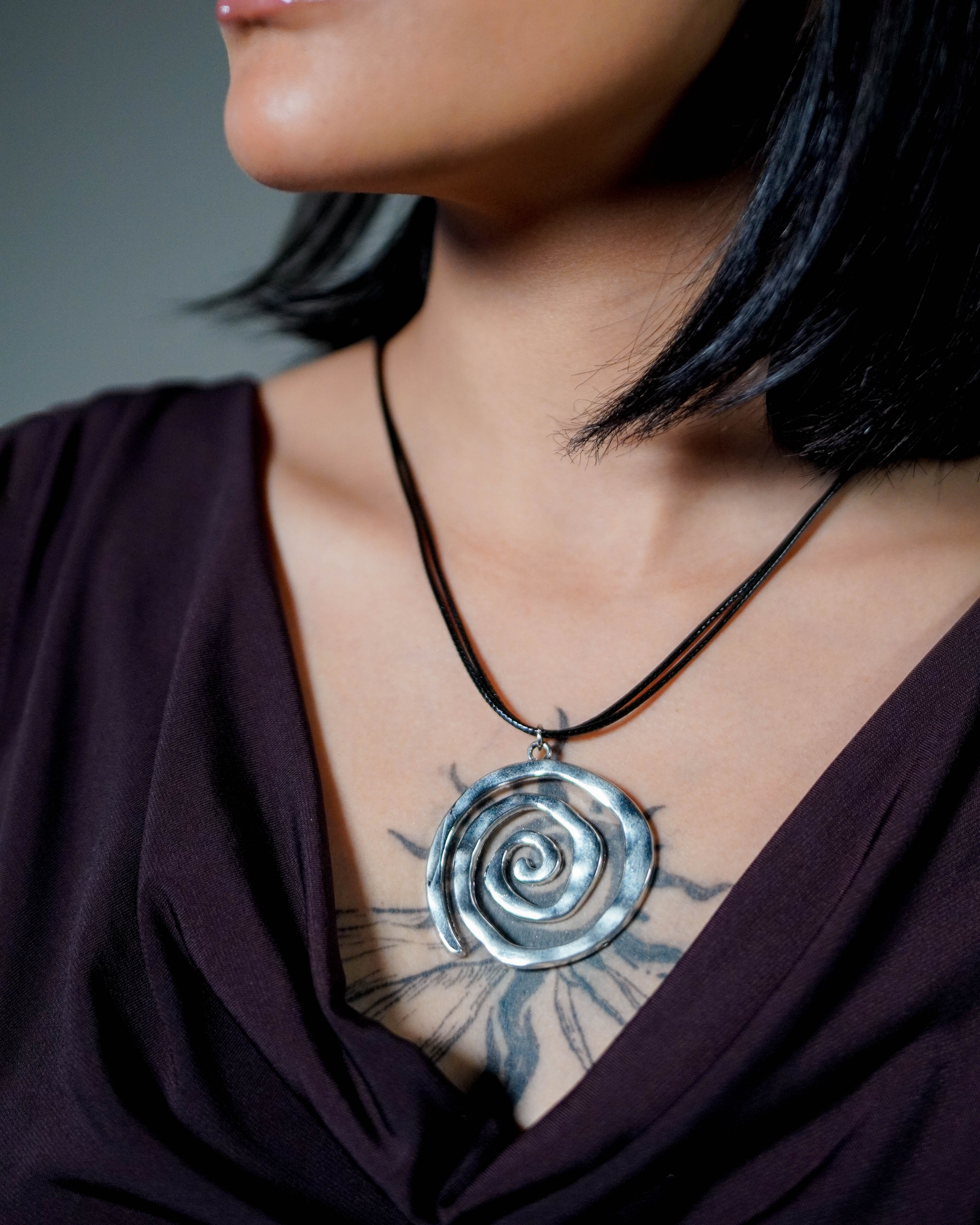A clean spiral with a little edge. The Coiled Necklace sits close to the collarbone with a sculptural, silver-toned pendant that catches light from every angle. Minimal enough for everyday, but it still feels like a statement.