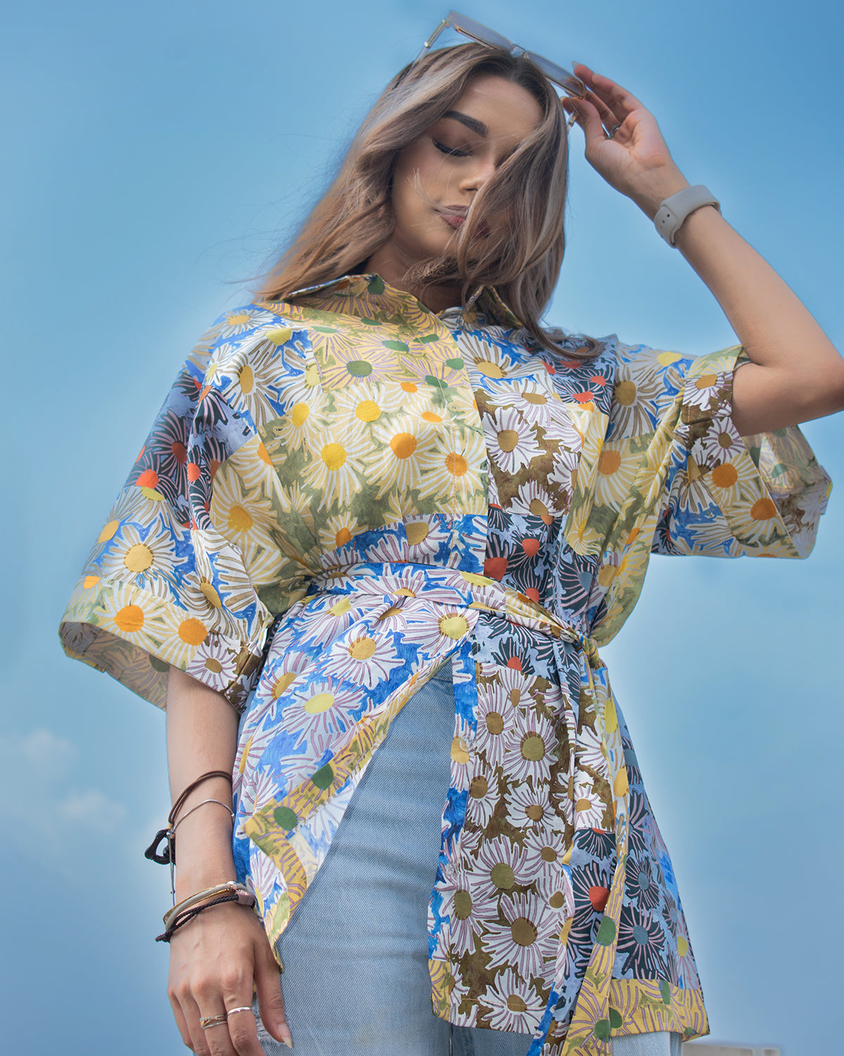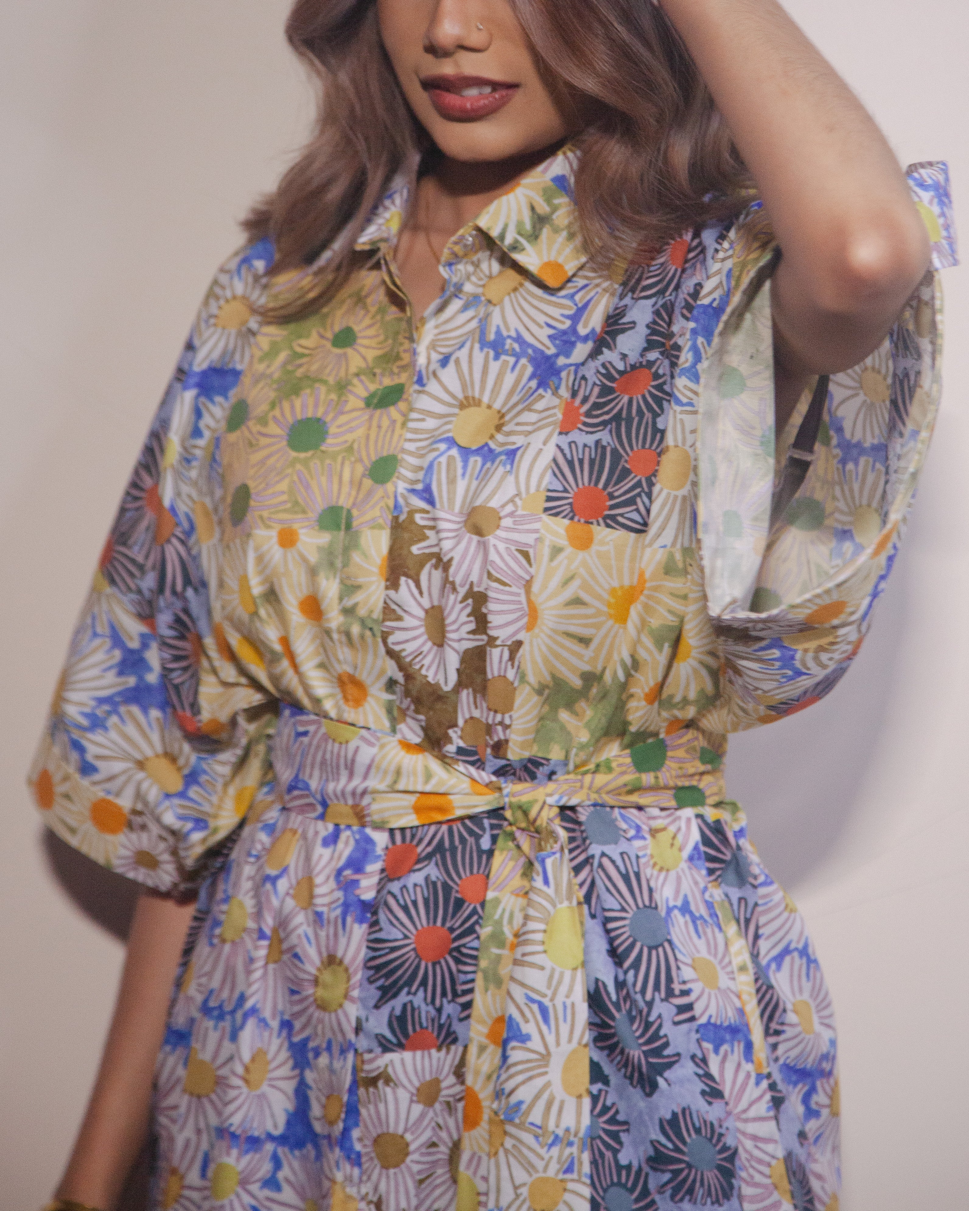 Note: This piece has been sized for an ideal fit (allowing for ease over the hip) This belted tunic shirt recalls the spirit of Van Gogh’s Sunflowers, with bursts of yellow and blue. Crafted in a breathable fabric that holds the shape of the sleeves. Material: Linen Blend XS/M: Hip: 40, Length: 30 S/M: Hip: 42, Length: 30.5 |