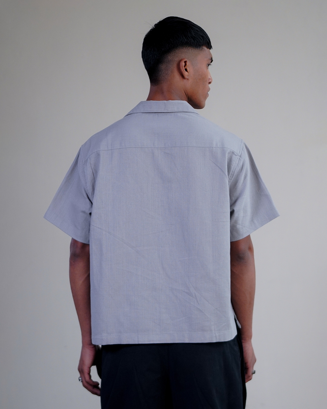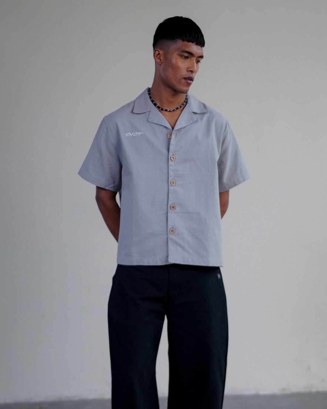 A camp-collar shirt available in three colors. For everyday wear, with a subtle embrodery of Dhaka. 100% Cotton