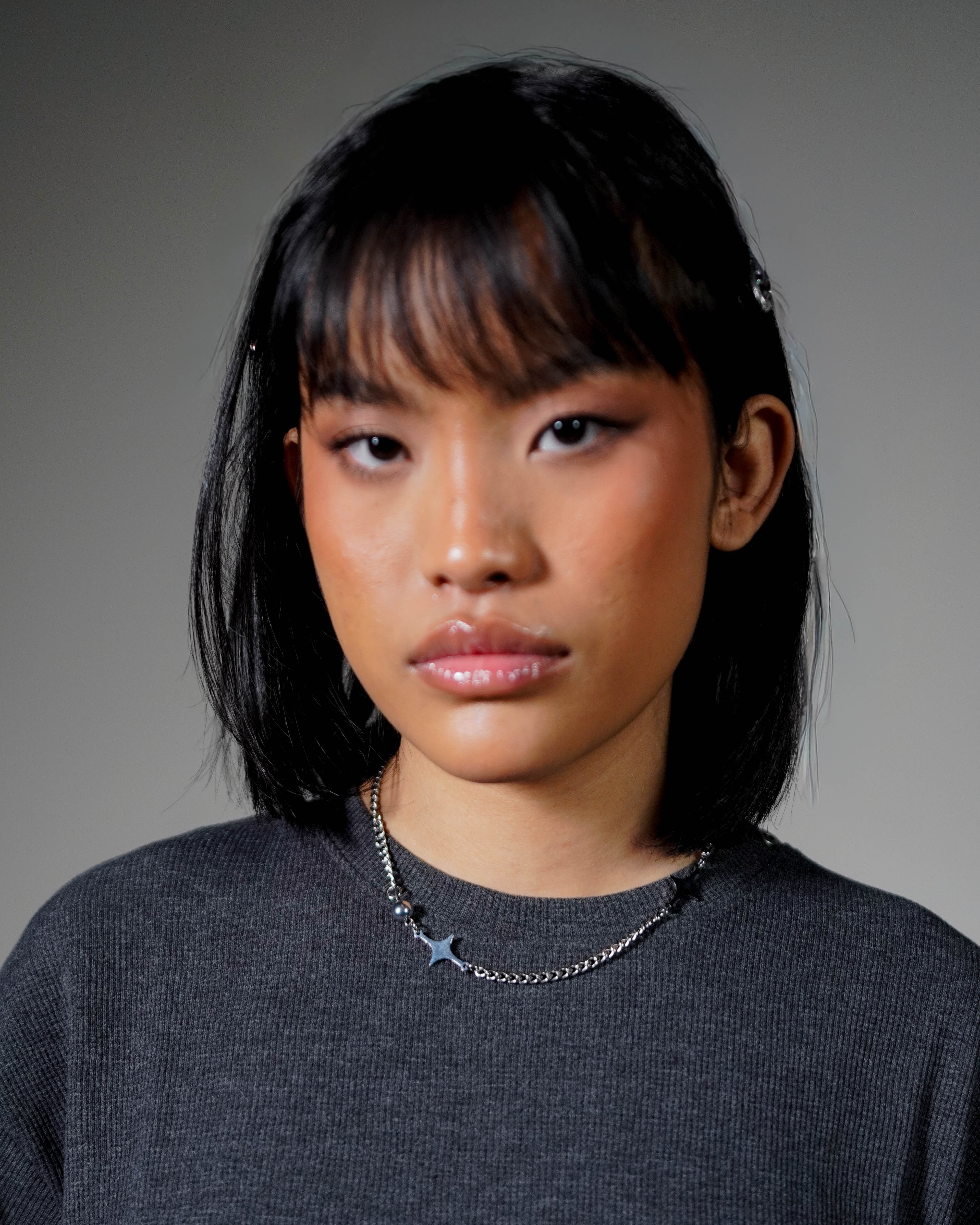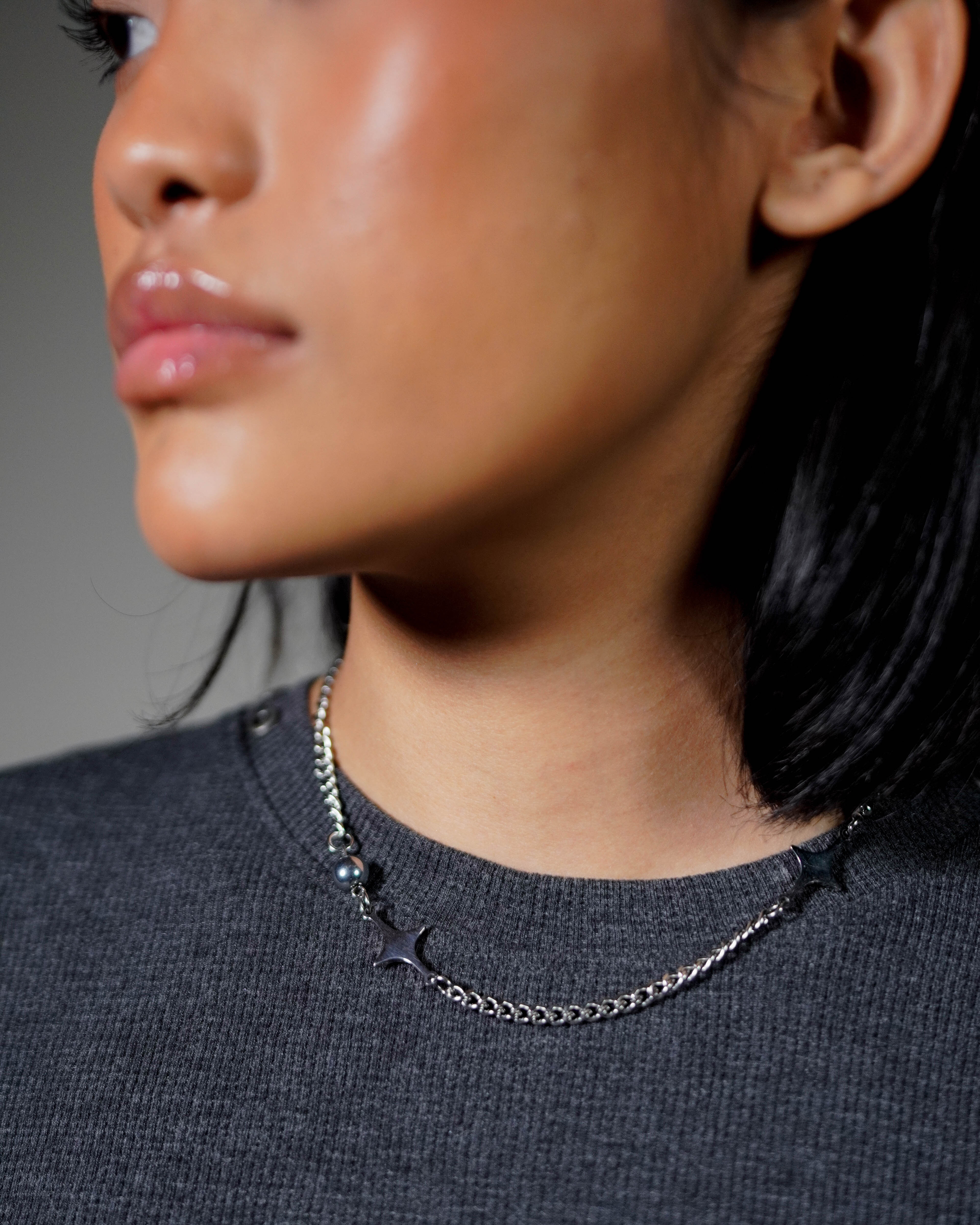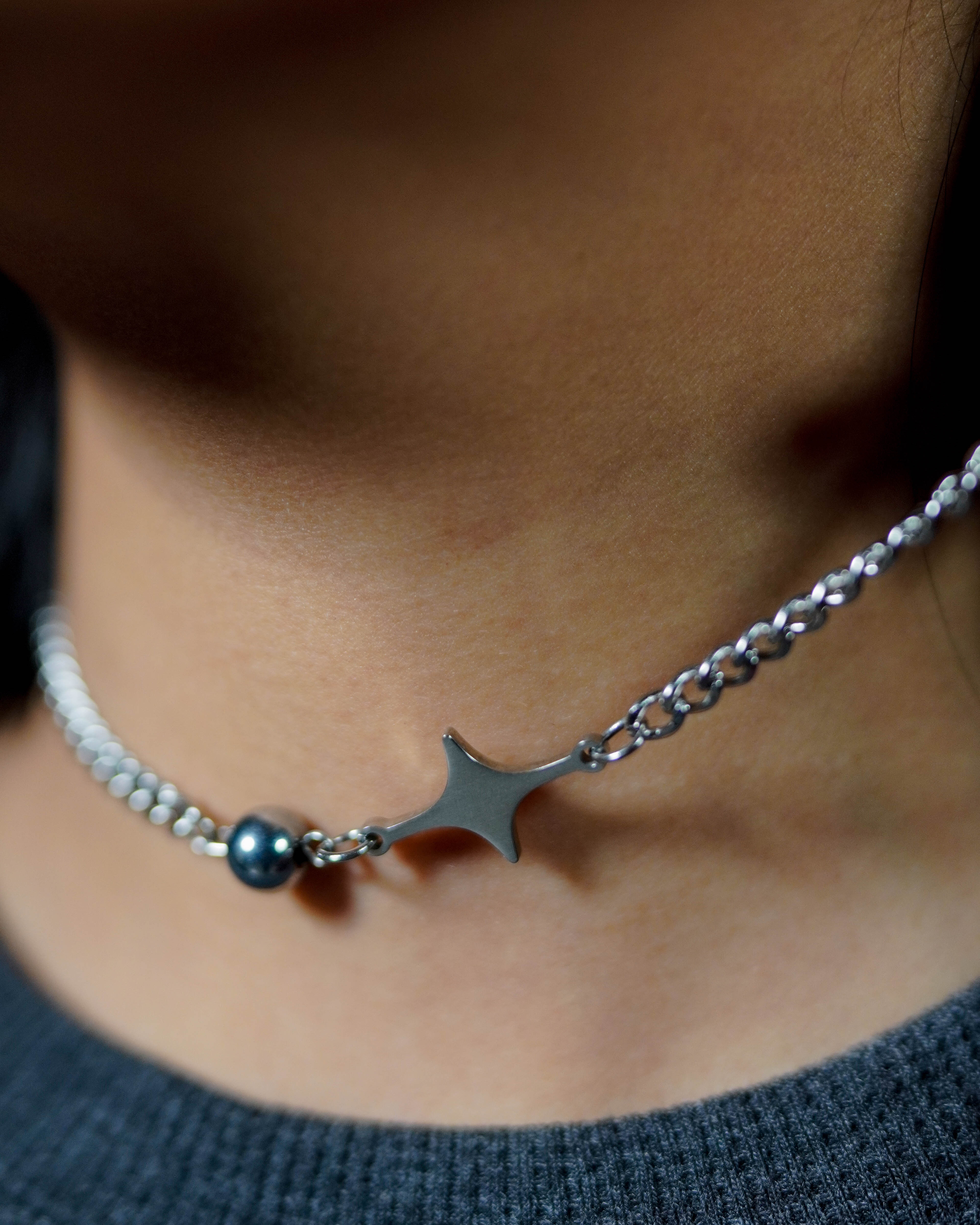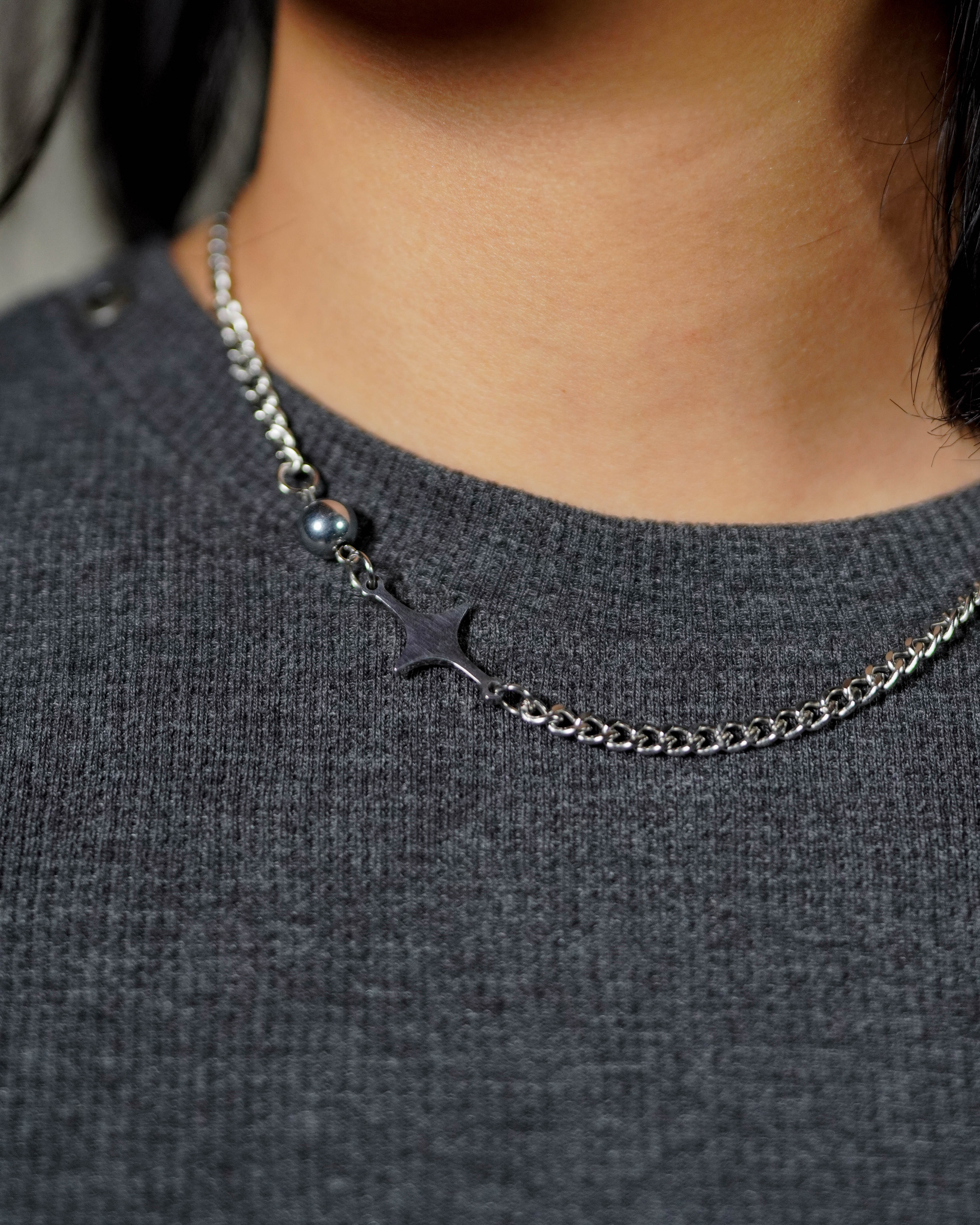 A sharp silver drop suspended from a mixed chain, finished with a single bead detail.