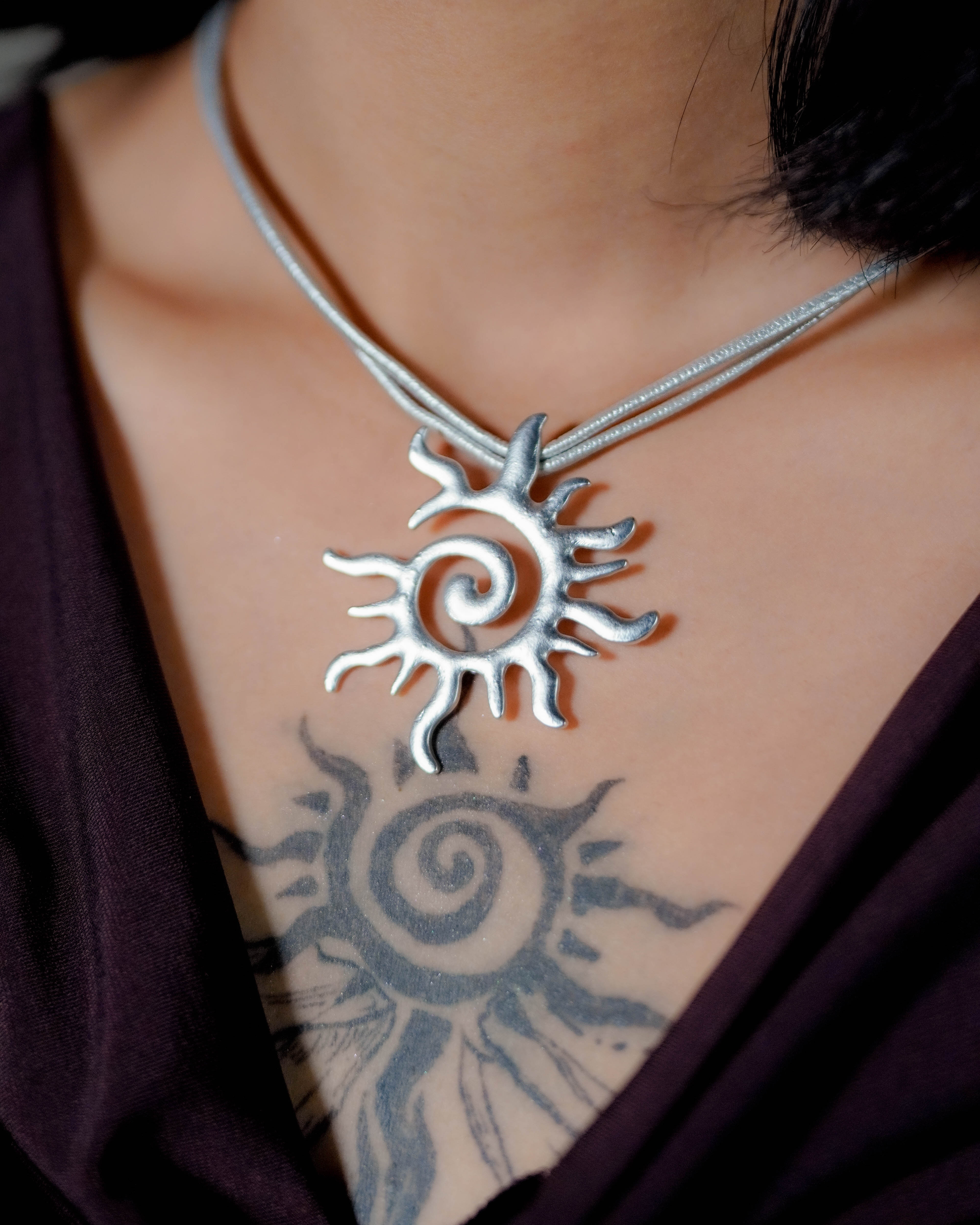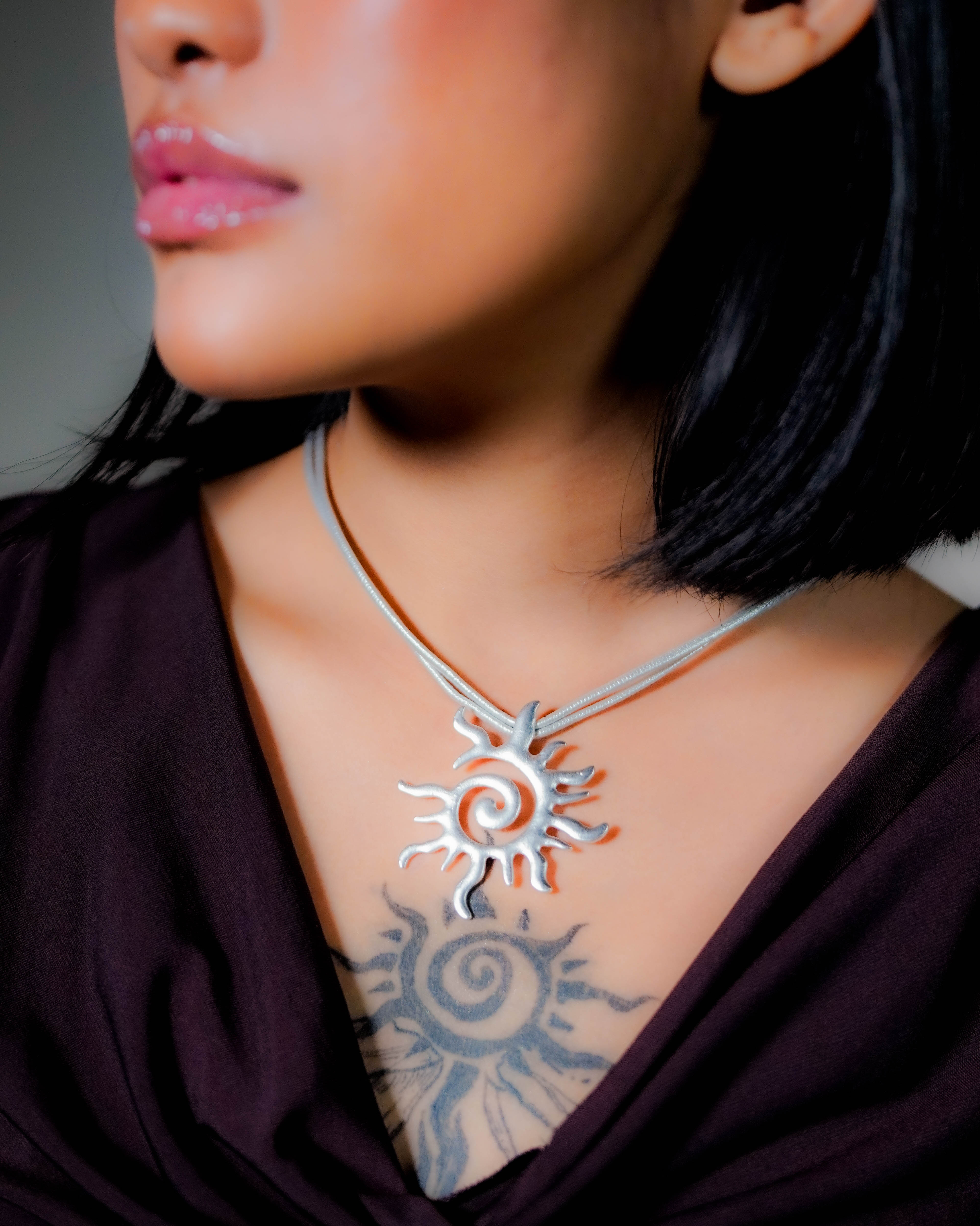 A little solar energy, worn close. This piece features a matte silver-toned sun pendant with a coiled spiral at the center and flame-like rays that feel organic, almost hand-formed. It sits on double satin cords for a clean, soft drape and an easy statement that doesn’t need layering.