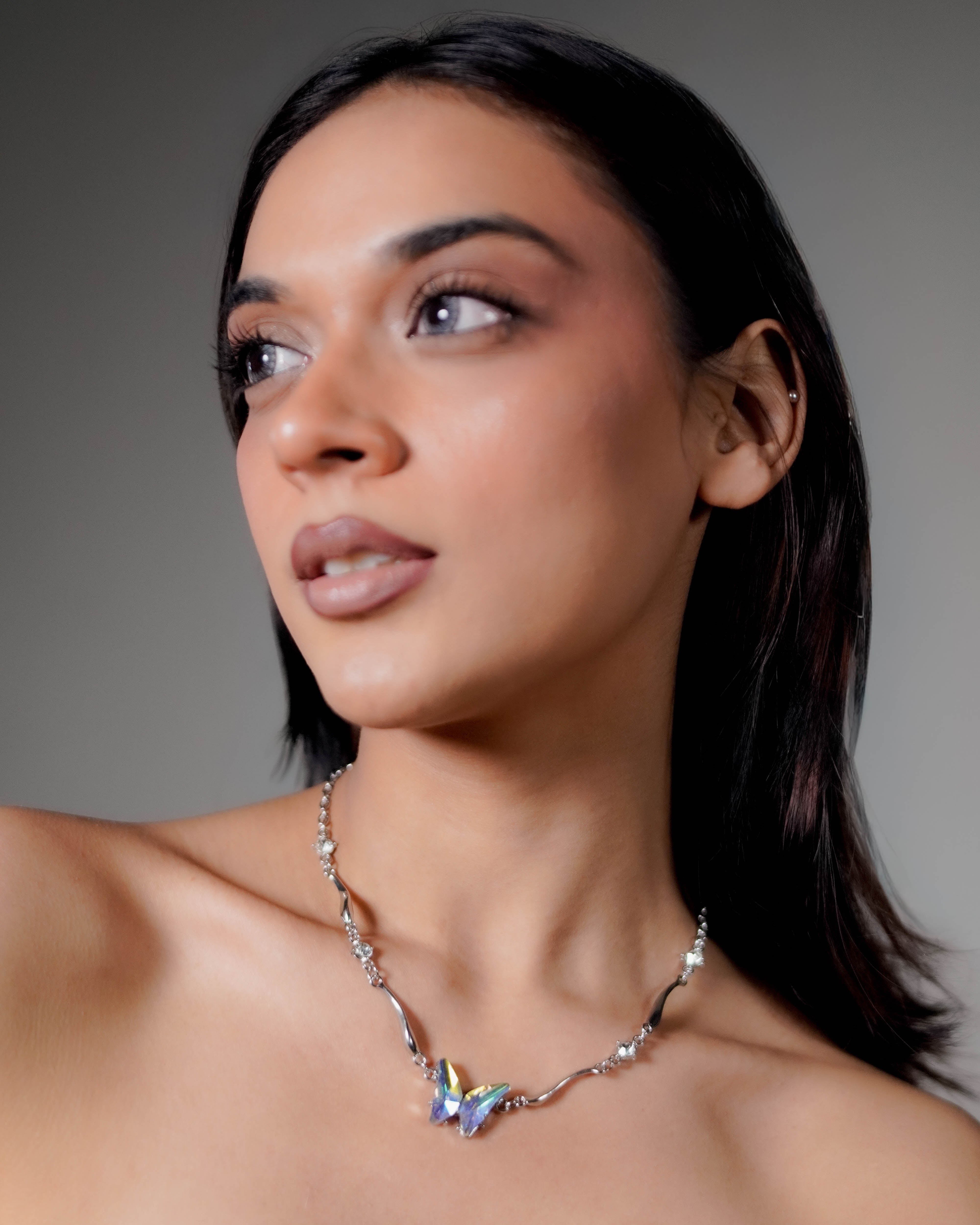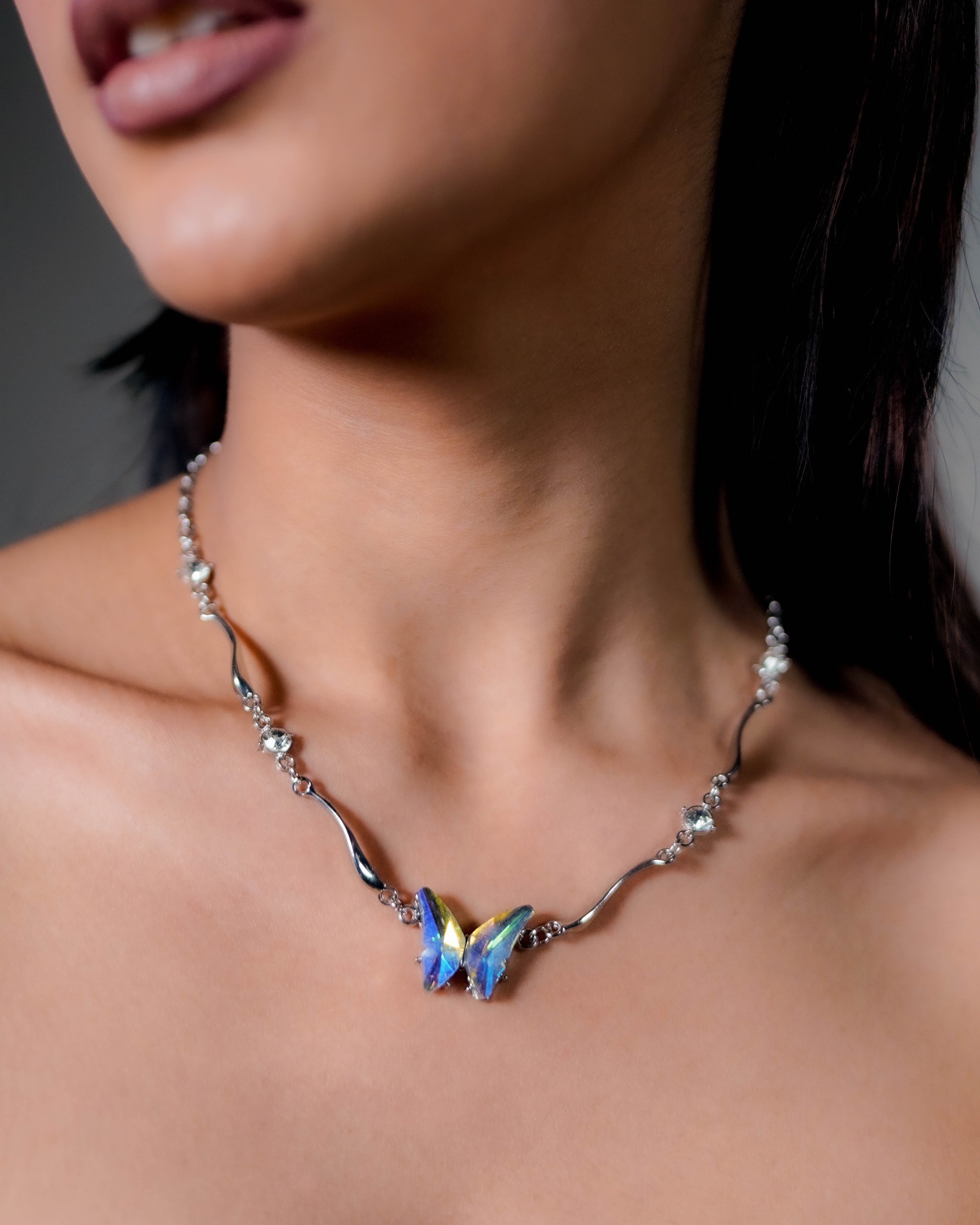 A soft shimmer with a sharp little glow. Prismwing sits delicately on the collarbone with a butterfly-cut crystal that flashes blue, green, and gold as it moves. The chain is kept light and fluid, with subtle wave links and tiny stone details that catch light without trying too hard.