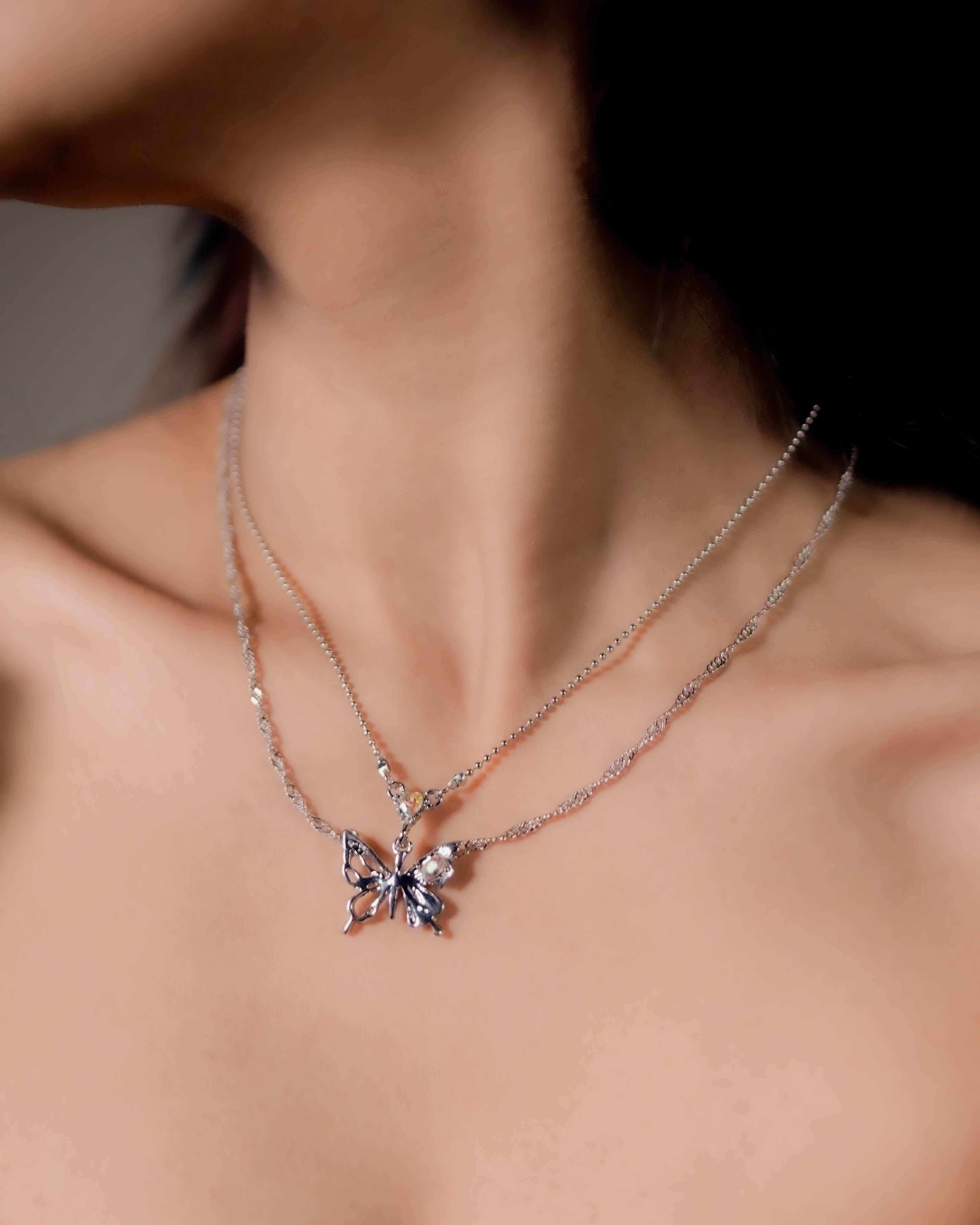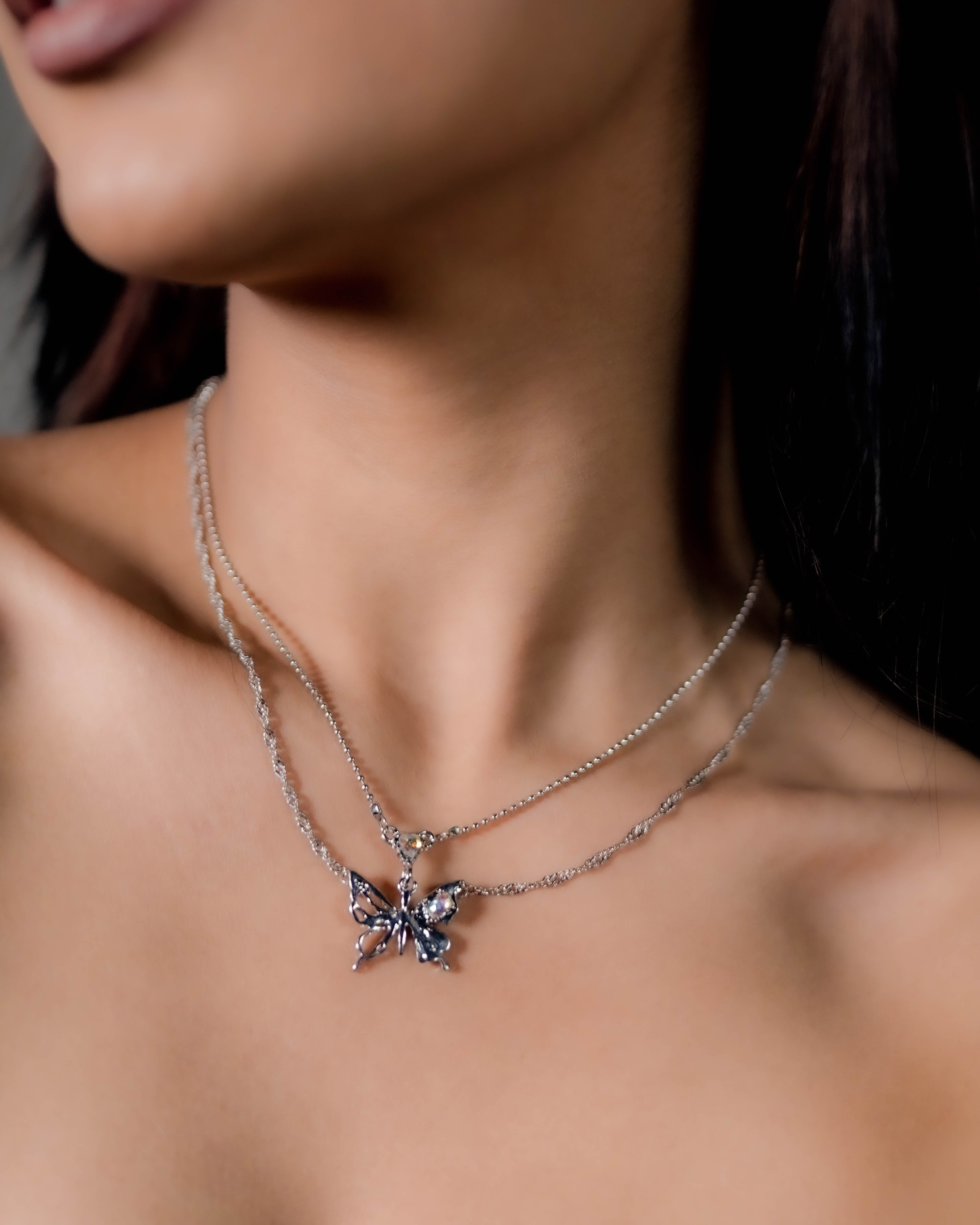 A sculpted butterfly set with subtle stones, suspended on layered silver chains.