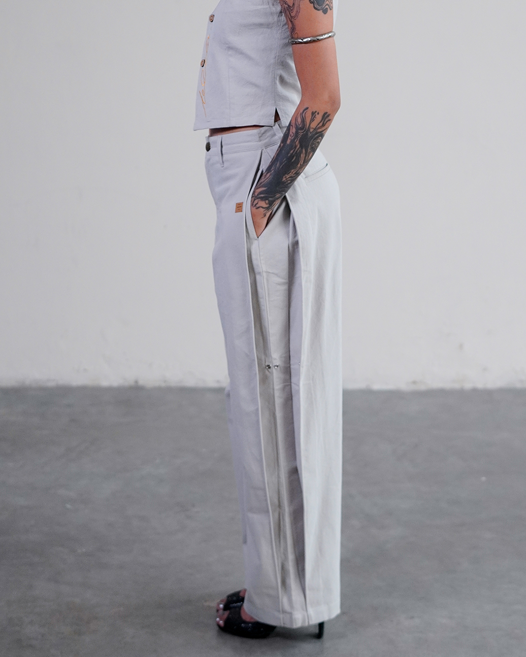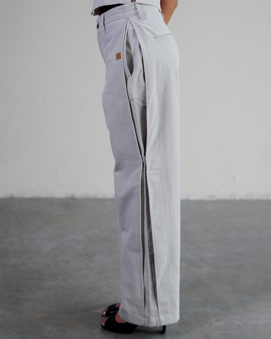 You have never seen pants like this before. Inspired by the juxtaposition of the Dhoti, and tailored pleats. Adjustable pants with snapbuttons to alter between a classic look, and a more streetfriendly dhoti look. Wear them as you wish, adjust as you go. 100% Cotton. Iron before wear