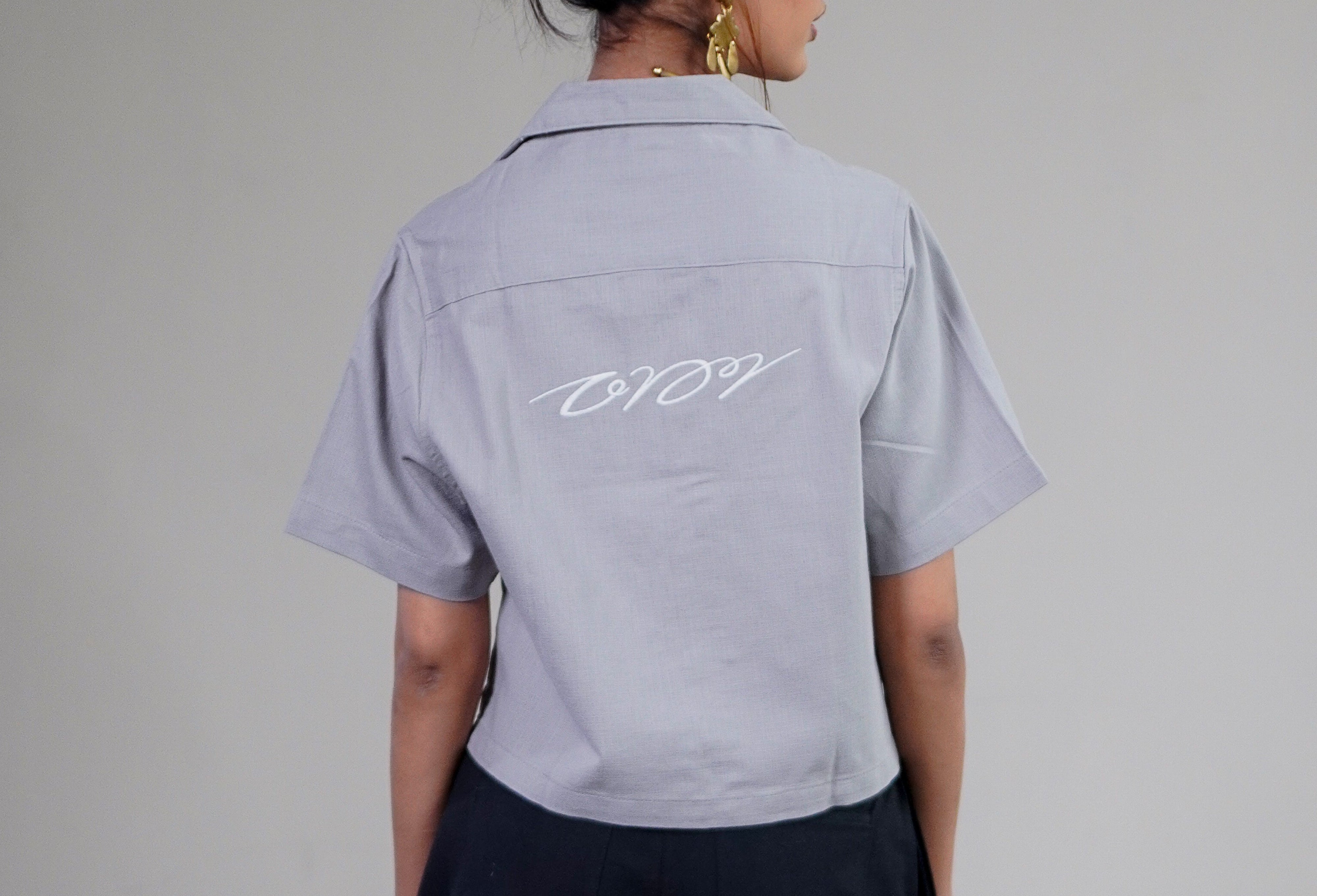 A cropped camp-collar shirt available in three colors. Embroidered with Dhaka's signature. 100% Cotton